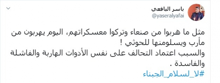 وكتب اليافعي عبر تغريدة له على "تويتر" رصدها " المشهد العربي":"مثل ما هربوا من صنعاء وتركوا معسكراتهم، اليوم يهربون من مأرب ويسلمونها للحوثي".