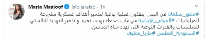 كشفت الإعلامية اللبنانية ماريا معلوف، اليوم، سبب قيام التحالف العربي بتدمير أهداف عسكرية لمليشيات الحوثي في اليمن.
