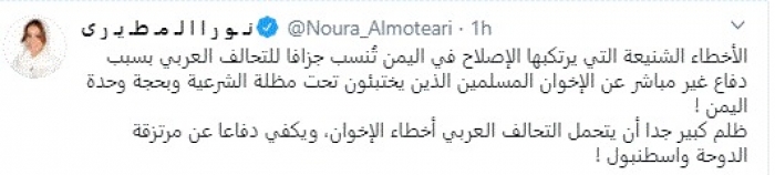 وأضافت: "ظلم كبير جدًا أن يتحمل التحالف العربي أخطاء الإخوان، ويكفي دفاعًا عن مرتزقة الدوحة وإسطنبول".