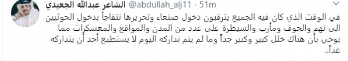 طالب الشاعر عبدالله الجعيدي، اليوم، بتدارك الخلل داخل حكومة الشرعية وذلك بعد سيطرة مليشيات الحوثي على بعض المدن والمواقع والمعسكرات الجديدة باليمن.