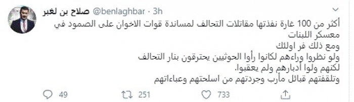 وقال في تغريدة عبر "تويتر" رصدها "المشهد العربي": "أكثر من 100 غارة نفذتها مقاتلات التحالف لمساندة قوات الإخوان على الصمود في معسكر اللبنات ومع ذلك فر أولئك".