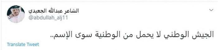انتقد الشاعر عبدالله الجعيدي، اليوم، ما يسمى بالجيش الوطني التابع لحكومة الشرعية، مشيرًا إلى أنه لا يحمل من الوطنية سوى الاسم.