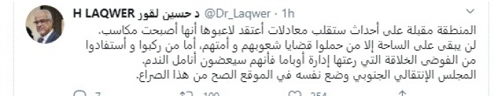 وكتب في تغريدة عبر "تويتر" رصدها "المشهد العربي": "المنطقة مقبلة على أحداث ستقلب معادلات اعتقد لاعبوها أنها أصبحت مكاسب".