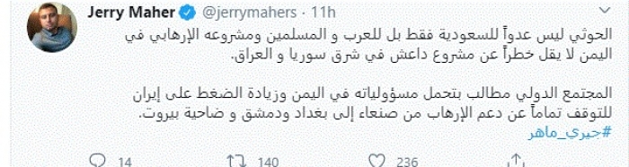 قال الكاتب الصحفي اللبناني جيري ماهر، اليوم، إن مشروع مليشيات الحوثي لا يقل خطرًا عن تنظيم داعش الإرهابي.