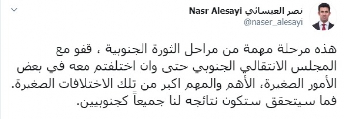 وكتب العيسائي عبر تغريدة له على "تويتر" رصدها " المشهد العربي":"هذه مرحلة مهمة من مراحل الثورة الجنوبية ، اصطفوا خلف المجلس الانتقالي الجنوبي حتى وإن اختلفتم معه في بعض الأمور الصغيرة".