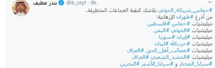 وكتب في تغريدة عبر "تويتر" رصدها "المشهد العربي": "حماس شريكة الحوثي بلاشك كبقية الجماعات المتطرفة.. ومن أذرع طهران الإرهابية: مليشيات حماس فلسطين، الحوثي اليمن، مليشيات إيران بسوريا، حزب الله لبنان، عصائب أهل الحق العراق، الحشد الشعبي العراق، سرايا المختار وسرايا الأشتر البحرين".