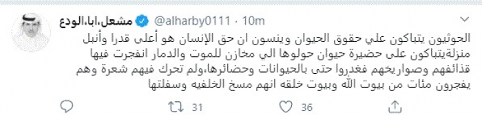 وقال في تغريدة عبر "تويتر" رصدها "المشهد العربي": "الحوثيون يتباكون على حقوق الحيوان وينسون أن حق الإنسان هو أعلى قدرا وأنبل منزلة يتباكون على حضيرة حيوان حولوها إلى مخازن للموت والدمار انفجرت فيها قذائفهم وصواريخهم فغدروا حتى بالحيوانات وحضائرها، ولم تحرك فيهم شعرة وهم يفجرون مئات من بيوت الله وبيوت خلقه أنهم مسخ الخليقة وسفلتها".