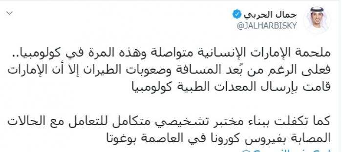وكتب الحربي عبر تغريدة له على "تويتر" رصدها " المشهد العربي":"ملحمة الإمارات الإنسانية متواصلة وهذه المرة في كولومبيا،فعلى الرغم من بُعد المسافة وصعوبات الطيران إلا أن الإمارات قامت بإرسال المعدات الطبية كولومبيا"