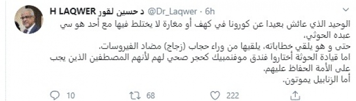وقال في تغريدة عبر "تويتر" رصدها "المشهد العربي": "الوحيد الذي عاش بعيدًا عن كورونا في كهف أو مغارة لا يختلط فيها مع أحد هو سي عبده الحوثي، حتى وهو يلقي خطاباته، يلقيها من وراء حجاب (زجاج) مضاد الفيروسات".