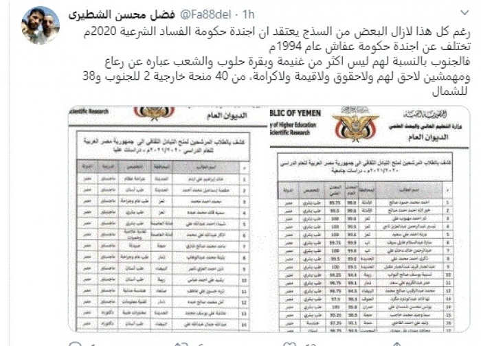 وأضاف: "فالجنوب بالنسبة لهم ليس أكثر من غنيمة وبقرة حلوب والشعب عبارة عن .... ومهمشين ﻻحق لهم وﻻحقوق وﻻ قيمة وﻻكرامة، من 40 منحة خارجية 2 للجنوب و38 للشمال".