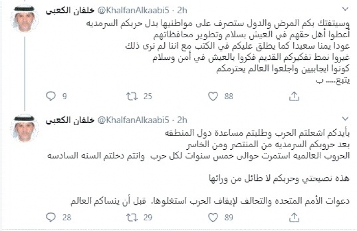 وأوضح: "الدين النصيحة العالم يعيش أيام عصيبة والجميع يسعى لتجنب وباء كورونا في ظل تباطؤ الاقتصاد العالمي. انصح الأخوة في اليمن بإيقاف حربهم التي لن ينتصر فيها أحد".