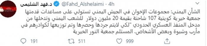 وقال في تغريدة عبر "تويتر" رصدها "المشهد العربي": "الشأن اليمني: مجموعات الإخوان في الجيش اليمني تستولي على مساعدات قدمتها جمعية خيرية كويتية 107 شاحنة بقيمة 20 مليون دولار للشعب اليمني وتدخلها من مدخل المنفذ العسكري الحدودي لكي لايتم جردها وحصرها وتم توزيعها لكوادرهم في مأرب وشبوة وبعض الأشخاص. المستلم جمعية النور الخيرية".