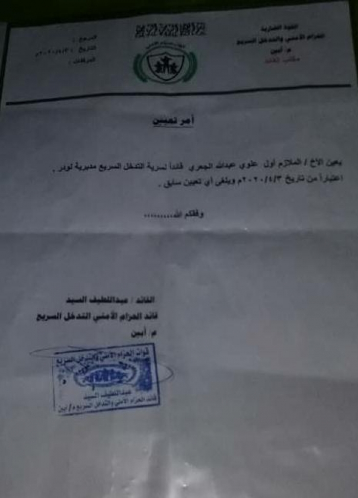 أصدر قائد قوات الحزام الأمني والتدخل السريع بمحافظه أبين، العميد عبد اللطيف السيد، قرارا بتعيين عبد الله الجعري قائدا لقوات التدخل السريع بمديرية لودر.