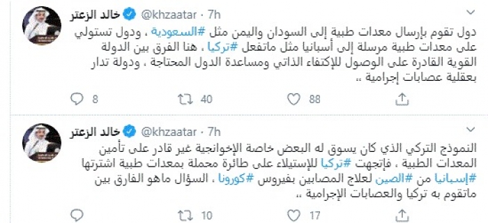 وأضاف: "دول تقوم بإرسال معدات طبية إلى السودان واليمن مثل السعودية، ودول تستولي على معدات طبية مرسلة إلى إسبانيا مثل ما تفعل تركيا، هنا الفرق بين الدولة القوية القادرة على الوصول للاكتفاء الذاتي ومساعدة الدول المحتاجة، ودولة تدار بعقلية عصابات إجرامية".