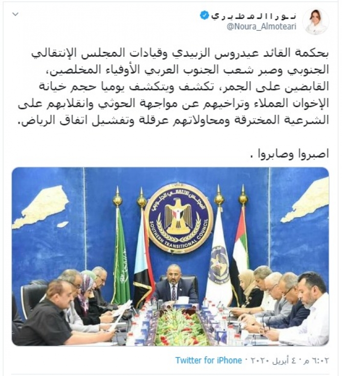وكتبت "المطيري" في تغريدة عبر حسابها بتويتر، رصدها "المشهد العربي" قالت فيها: "بحكمة القائد عيدروس الزبيدي وقيادات المجلس الإنتقالي الجنوبي وصبر شعب الجنوب العربي الأوفياء المخلصين، القابضين على الجمر، تكشف ويتكشف يوميا حجم خيانة الإخوان العملاء وتراخيهم عن مواجهة الحوثي وانقلابهم على الشرعية المخترقة ومحاولاتهم عرقلة وتفشيل اتفاق الرياض".