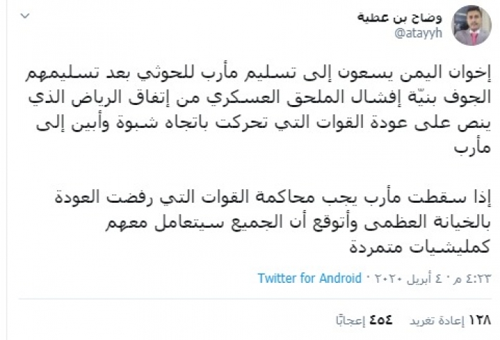 وكتب "بن عطية" في تغريدة عبر تويتر، رصدها "المشهد العربي" قال فيها: "إخوان اليمن يسعون إلى تسليم مأرب للحوثي بعد تسليمهم الجوف بنيّة إفشال الملحق العسكري من اتفاق الرياض الذي ينص على عودة القوات التي تحركت باتجاه شبوة وأبين إلى مأرب".