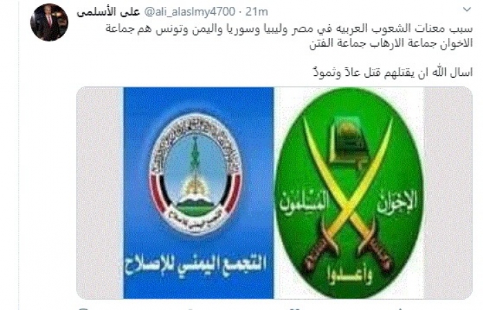 وقال في تغريدة عبر "تويتر" رصدها "المشهد العربي": "سبب معاناة الشعوب العربيه في مصر وليبيا وسوريا واليمن وتونس هم جماعة الإخوان جماعة الإرهاب جماعة الفتن.. اسأل الله أن يقتلهم قتل عادً وثمودٌ".
