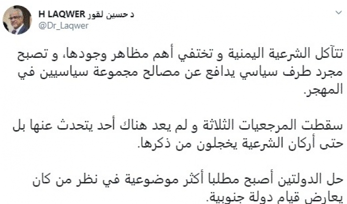 وكتب في تغريدة عبر "تويتر" رصدها "المشهد العربي": "تتآكل الشرعية اليمنية وتختفي أهم مظاهر وجودها، وتصبح مجرد طرف سياسي يدافع عن مصالح مجموعة سياسيين في المهجر".