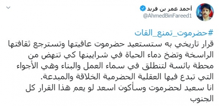 وكتب بن فريد عبر تغريدة له على "تويتر" رصدها " المشهد العربي":"قرار تاريخي به ستستعيد حضرموت عافيتها وتسترجع ثقافتها الراسخة وتضخ دماء الحياة في شرايينها كي تنهض من محطة بائسة لتنطلق في سماء العمل والبناء وهي الأجواء التي تبدع فيها العقلية الحضرمية الخلاقة والمبدعة".