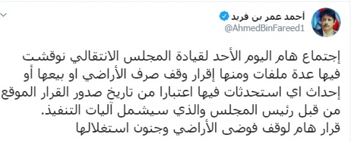 وكتب بن فريد عبر تغريدة له على "تويتر" رصدها " المشهد العربي":" اجتماع هام اليوم الأحد لقيادة المجلس الانتقالي نوقشت فيها عدة ملفات ومنها إقرار وقف صرف الأراضي أو بيعها أو إحداث إي استحداثات فيها اعتباراً من تاريخ صدور القرار الموقع من قبل رئيس المجلس والذي سيشمل آليات التنفيذ".
