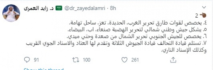 وأوضح: "يشكل جيش وطني شمالي لتحرير الهضبة صنعاء، إب، البيضاء. ويخصص للجيش الجنوبي تحرير الشمال من صعدة وحتى ميدي".