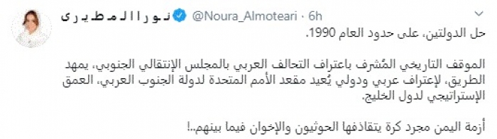 وكتبت في تغريدة عبر "تويتر" رصدها "المشهد العربي": "حل الدولتين، على حدود العام 1990. الموقف التاريخي المُشرف باعتراف التحالف العربي بالمجلس الانتقالي الجنوبي، يمهد الطريق، لاعتراف عربي ودولي يُعيد مقعد الأمم المتحدة لدولة الجنوب العربي، العمق الاستراتيجي لدول الخليج".