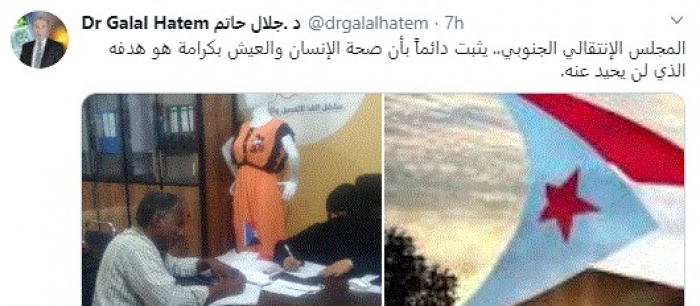 وقال في تغريدة عبر "تويتر" رصدها "المشهد العربي": "المجلس الانتقالي الجنوبي.. يثبت دائماً بأن صحة الإنسان والعيش بكرامة هو هدفه الذي لن يحيد عنه".