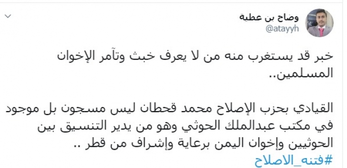 وأضاف :"القيادي بحزب الإصلاح محمد قحطان ليس مسجونا بل موجود في مكتب عبد الملك الحوثي وهو من يدير التنسيق بين الحوثيين وإخوان اليمن برعاية وإشراف من قطر".
