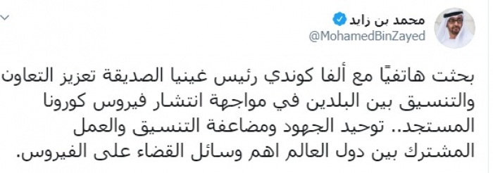 وكتب بن زايد عبر تغريدة له على "تويتر" رصدها " المشهد العربي":"بحثت هاتفيًا مع ألفا كوندي رئيس غينيا الصديقة تعزيز التعاون والتنسيق بين البلدين في مواجهة انتشار فيروس كورونا المستجد".