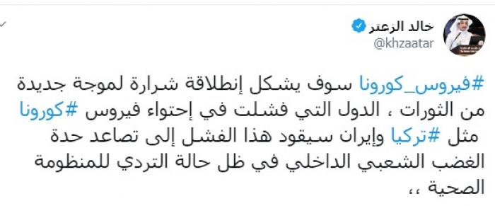 وأضاف:" الدول التي فشلت في احتواء فيروس كورونا مثل تركيا وإيران سيقود هذا الفشل إلى تصاعد حدة الغضب الشعبي الداخلي في ظل حالة التردي للمنظومة الصحية".