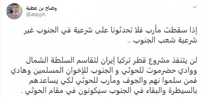وكتب في تغريدة عبر "تويتر" رصدها "المشهد العربي": "إذا سقطت مأرب فلا تحدثونا على شرعية في الجنوب غير شرعية شعب الجنوب.. لن يتنفذ مشروع قطر تركيا إيران لتقاسم السلطة الشمال ووادي حضرموت للحوثي والجنوب للإخوان المسلمين وهادي فمن سلموا نهم والجوف ومأرب للحوثي لكي يساعدهم بالسيطرة والبقاء في الجنوب سيكونون في مقام الحوثي".
