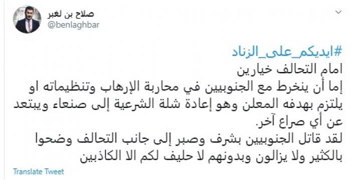وكتب في تغريدة عبر "تويتر" رصدها "المشهد العربي": "أمام التحالف خيارين إما أن ينخرط مع الجنوبيين في محاربة الإرهاب وتنظيماته أو يلتزم بهدفه المعلن وهو إعادة شلة الشرعية إلى صنعاء ويبتعد عن أي صراع آخر. لقد قاتل الجنوبيين بشرف وصبر إلى جانب التحالف وضحوا بالكثير ولا يزالون وبدونهم لا حليف لكم إلا الكاذبين".