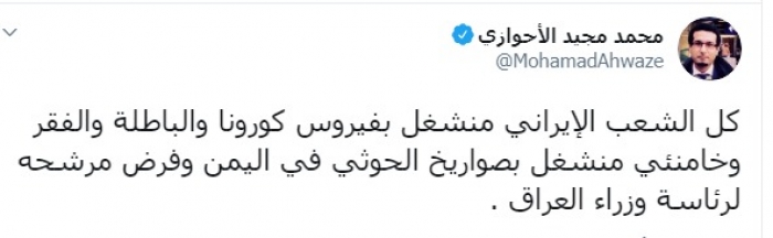 وكتب الأحوزاي عبر تغريدة له على "تويتر" رصدها " المشهد العربي":"كل الشعب الإيراني منشغل بفيروس كورونا والبطالة والفقر، وخامنئي منشغل بصواريخ الحوثي في اليمن وفرض مرشحه لرئاسة وزراء العراق".