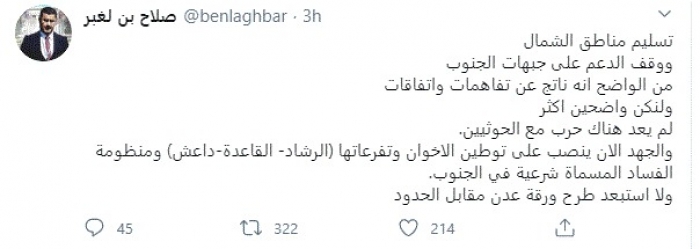 وكتب في تغريدة عبر "تويتر" رصدها "المشهد العربي": "تسليم مناطق الشمال ووقف الدعم على جبهات الجنوب من الواضح انه ناتج عن تفاهمات واتفاقات ولنكن واضحين أكثر لم يعد هناك حرب مع الحوثيين".