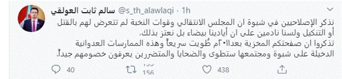 وقال في تغريدة عبر "تويتر" رصدها "المشهد العربي": "نذكر الإصلاحيين في شبوة أن المجلس الانتقالي وقوات النخبة لم تتعرض لهم بالقتل أو التنكيل ولسنا نادمين على أن أيادينا بيضاء بل نعتز بذلك".