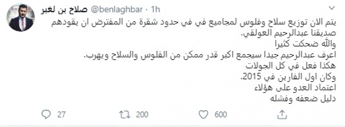 وقال في تغريدة عبر "تويتر" رصدها "المشهد العربي": "يتم الآن توزيع سلاح وفلوس لمجاميع في حدود شقرة من المفترض أن يقودهم صديقنا عبدالرحيم العولقي. والله ضحكت كثيراً. اعرف عبدالرحيم جيدًا سيجمع أكبر قدر ممكن من الفلوس والسلاح ويهرب".