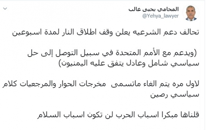وكتب غالب عبر تغريدة له على "تويتر" رصدها " المشهد العربي":"تحالف دعم الشرعية يعلن وقف إطلاق النار لمدة أسبوعين،ويدعم مع الأمم المتحدة في سبيل التوصل إلى حل سياسي شامل وعادل يتفق عليه اليمنيون".