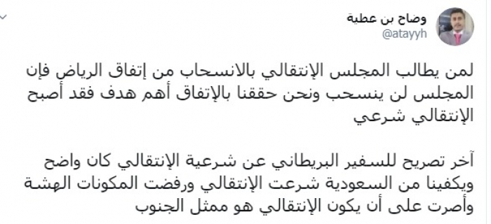 وكتب بن عطية عبر تغريدة له على "تويتر" رصدها " المشهد العربي":"لمن يطالب المجلس الانتقالي بالانسحاب من اتفاق الرياض فإن المجلس لن ينسحب ونحن حققنا بالاتفاق أهم هدف فقد أصبح الانتقالي شرعي".