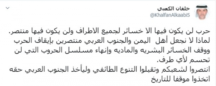 وكتب الكعبي عبر تغريدة له على "تويتر" رصدها "المشهد العربي":"حرب لن يكون فيها إلا خسائر لجميع الأطراف ولن يكون فيها منتصر".