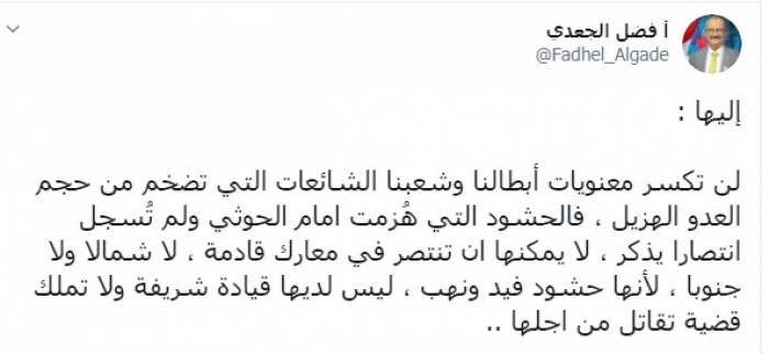 وكتب الجعدي عبر تغريدة له على "تويتر" رصدها " المشهد العربي": "لن تكسر معنويات أبطالنا وشعبنا الشائعات التي تضخم من حجم العدو الهزيل".