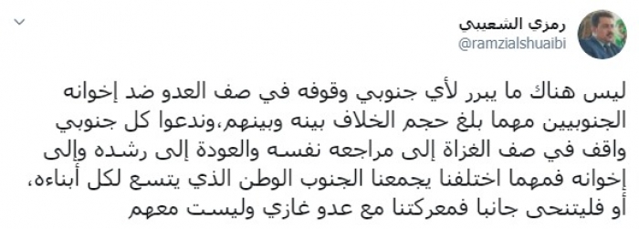 وكتب الشعيبي عبر تغريدة له على "تويتر" رصدها " المشهد العربي":"ليس هناك ما يبرر لأي جنوبي وقوفه في صف العدو ضد إخوانه الجنوبيين مهما بلغ حجم الخلاف بينه وبينهم".