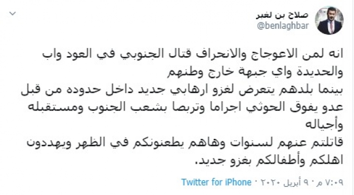 وكتب "بن لغبر" في تغريدة عبر حسابه بتويتر، رصدها "المشهد العربي" قال فيها: "آن الأوان لعودة كل المقاتلين الجنوبيين إلى وطنهم للدفاع عنه وعلى من في الجبهات التمترس في الحدود الجنوبية".