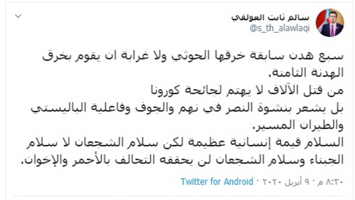 وكتب "العولقي" في تغريدة عبر حسابه بتويتر، رصدها "المشهد العربي" قال فيها: "سبع هدن سابقة خرقها الحوثي ولا غرابة أن يقوم بخرق الهدنة الثامنة".