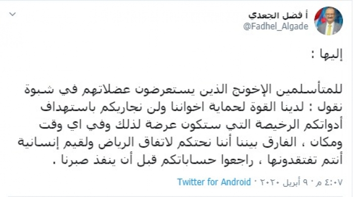 وكتب "الجعدي" في تغريدة عبر حسابه بتويتر، رصدها "المشهد العربي" قال فيها: "للمتأسلمين الإخونج الذين يستعرضون عضلاتهم في شبوة نقول : لدينا القوة لحماية إخواننا ولن نجاريكم باستهداف أدواتكم الرخيصة التي ستكون عرضة لذلك وفي أي وقت ومكان".