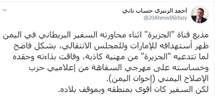 وكتب الربيزي عبر تغريدة له على "تويتر" رصدها " المشهد العربي":"مذيع قناة "الجزيرة" إثناء محاورته السفير البريطاني في اليمن ظهر استهدافه للإمارات وللمجلس الانتقالي، بشكل فاضح لما تتدعيه "الجزيرة" من مهنية كاذبة".