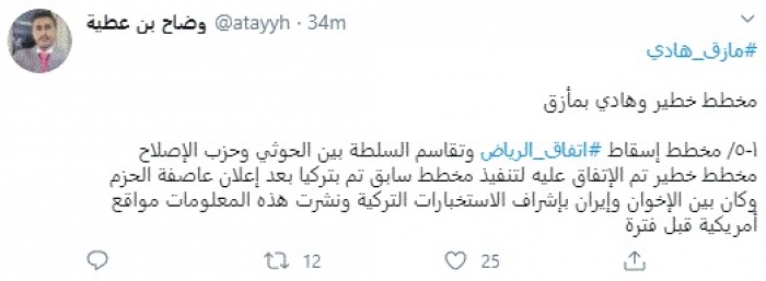 وقال في تغريدة عبر "تويتر" رصدها "المشهد العربي": " مخطط خطير وهادي بمأزق.. مخطط إسقاط اتفاق الرياض وتقاسم السلطة بين الحوثي وحزب الإصلاح مخطط خطير تم الاتفاق عليه لتنفيذ مخطط سابق تم بتركيا بعد إعلان عاصفة الحزم وكان بين الإخوان وإيران بإشراف الاستخبارات التركية ونشرت هذه المعلومات مواقع أمريكية قبل فترة".