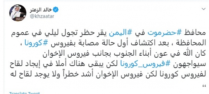 وكتب في تغريدة عبر "تويتر" رصدها "المشهد العربي": "محافظ حضرموت في اليمن يقر حظر تجول ليلي في عموم المحافظة، بعد اكتشاف أول حالة مصابة بفيروس كورونا، كان الله في عون أبناء الجنوب بجانب فيروس الإخوان سيواجهون فيروس كورونا".