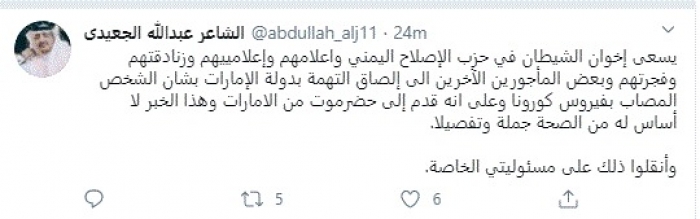 وقال في تغريدة عبر "تويتر" رصدها "المشهد العربي": "يسعى إخوان الشيطان في حزب الإصلاح اليمني وإعلامهم وإعلامييهم وزنادقتهم وفجرتهم وبعض المأجورين الآخرين الى إلصاق التهمة بدولة الإمارات بشان الشخص المصاب بفيروس كورونا وعلى أنه قدم إلى حضرموت من الإمارات وهذا الخبر لا أساس له من الصحة جملة وتفصيلا. وأنقلوا ذلك على مسئوليتي الخاصة".