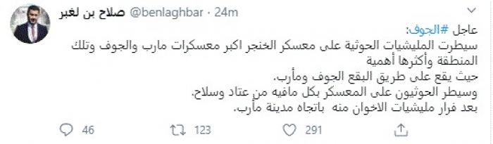 وكتب في تغريدة عبر "تويتر" رصدها "المشهد العربي": "الجوف: سيطرت المليشيات الحوثية على معسكر الخنجر أكبر معسكرات مأرب والجوف وتلك المنطقة وأكثرها أهمية. حيث يقع على طريق البقع الجوف ومأرب".