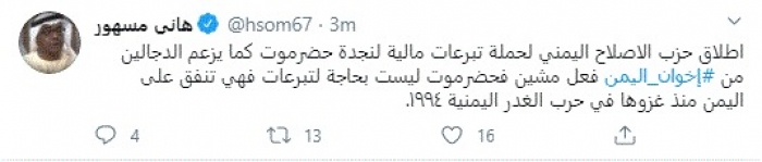 وقال في تغريدة عبر "تويتر" رصدها "المشهد العربي": "إطلاق حزب الإصلاح اليمني لحملة تبرعات مالية لنجدة حضرموت كما يزعم الدجالين من إخوان اليمن فعل مشين فحضرموت ليست بحاجة لتبرعات فهي تنفق على اليمن منذ غزوها في حرب الغدر اليمنية 1994".